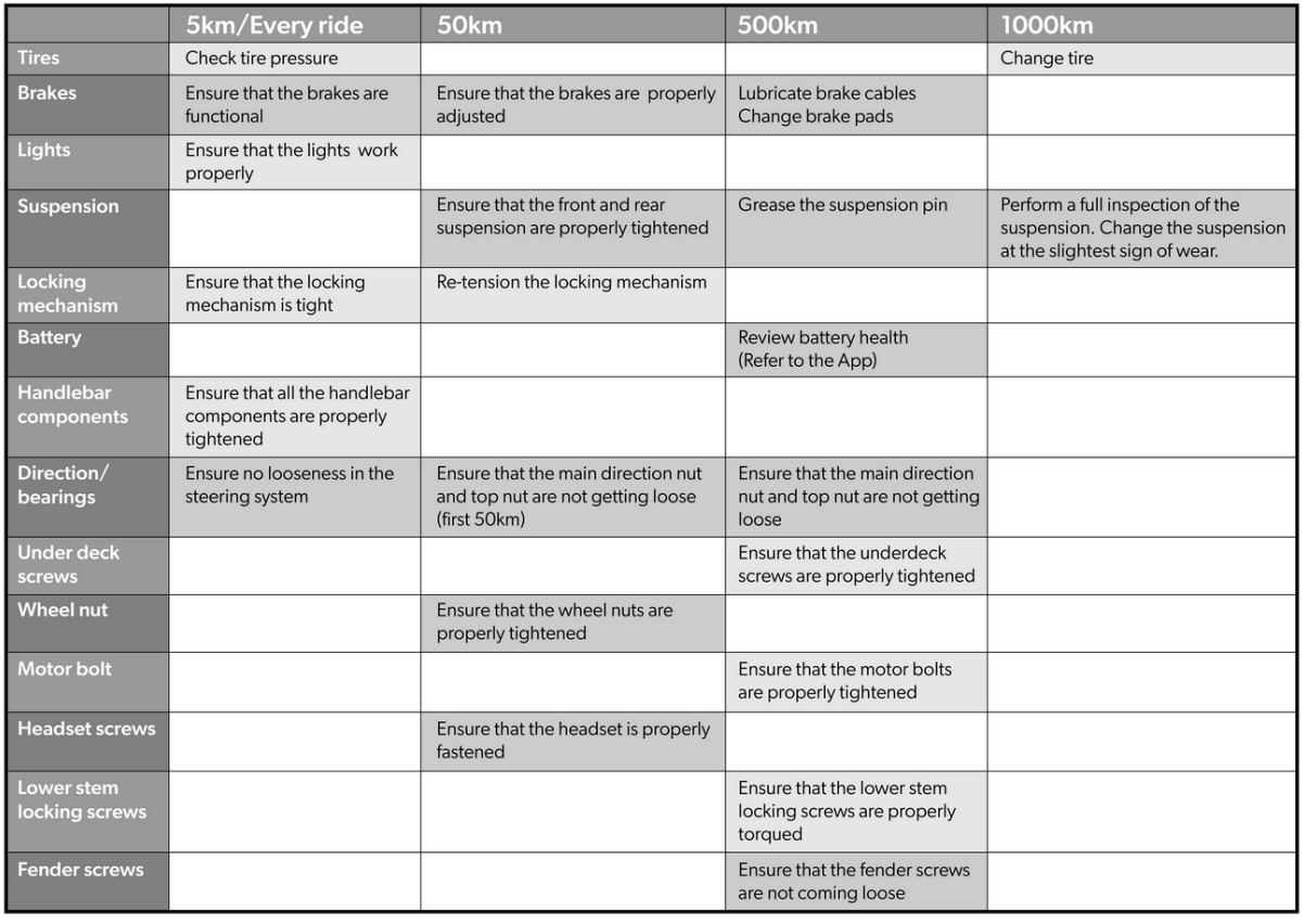 The following maintenance table should be used to determine when to inspect certain parts of the scooter, when to change certain components, and when to re-torque specific bolts and fasteners. This maintenance table is specific to the Apollo City 2023 scooter and will be modified as needed. You can also find a copy of this maintenance table in the User Manual below.