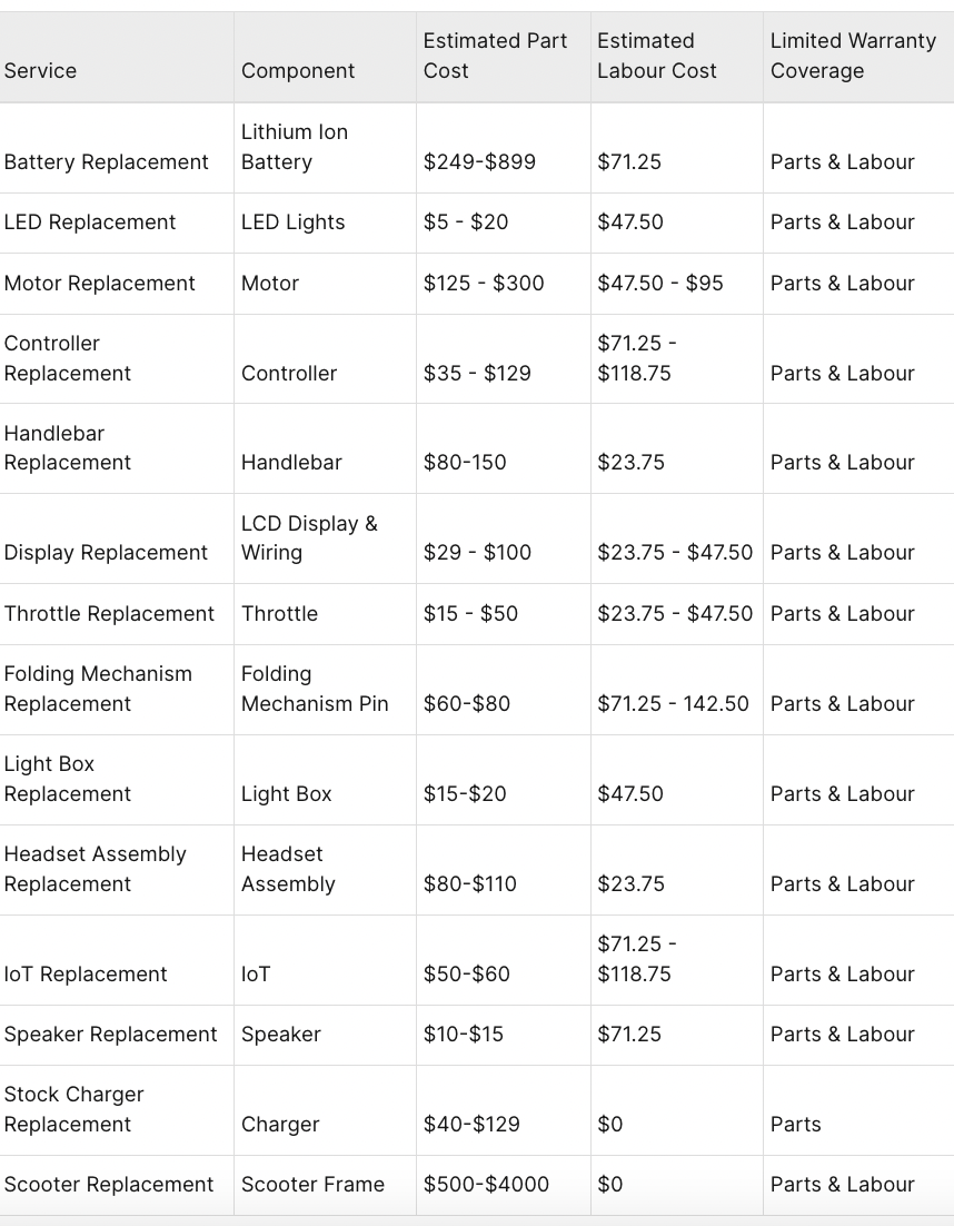 - For scooters deemed covered under the limited warranty, the costs in the above table will be waived.