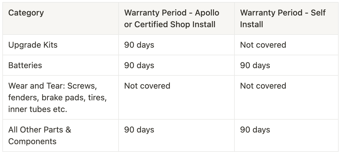 NOTE: Apollo Limited Warranty includes all components of the scooter, with the exception of specific parts including tires and inner tubes. **Minor cosmetic defects do not qualify for the Limited Warranty, please reach out to our support team via email or live chat for further assistance**.