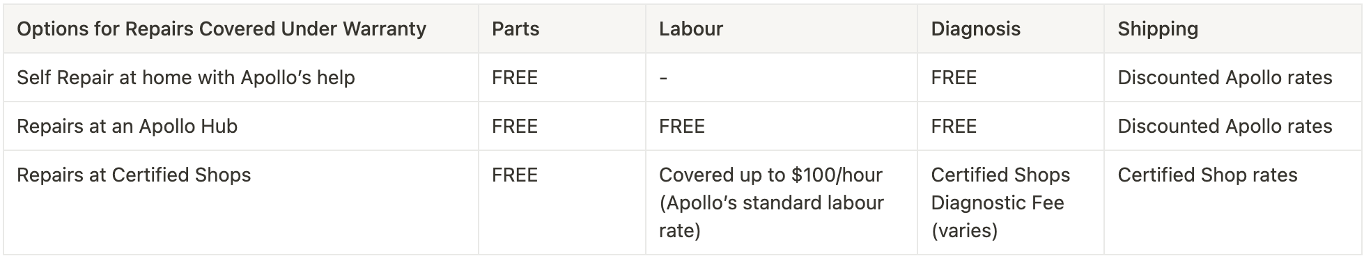 Certified Shops are authorized to charge their standard hourly and diagnostic rates. If the Certified Shop charges more than Apollo's rate for warranty repairs, you will be responsible for paying the difference.