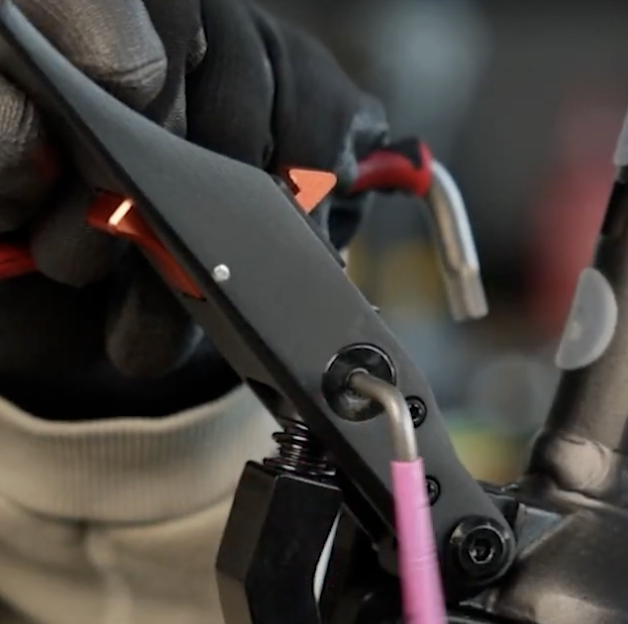 Locate the two side screws on the folding mechanism. Using the 3 mm Allen key, loosen both screws. These screws secure the clamp hook in place and must be loosened before adjusting the main bolt.