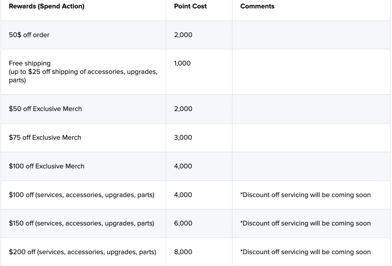 Yes, points can only be applied towards scooters, accessories, upgrades, spare parts, and merch.