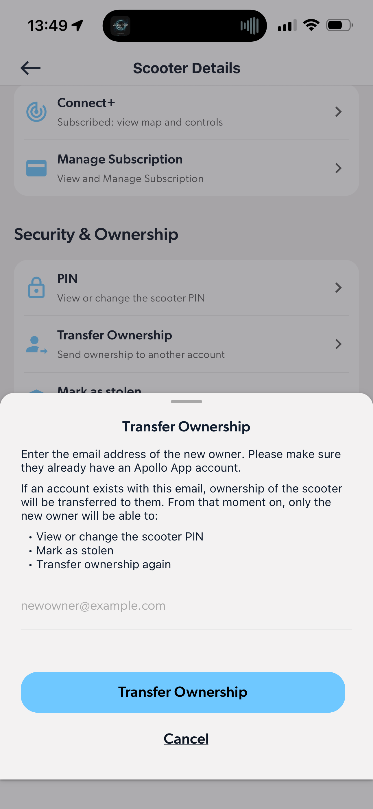 If you’re selling or giving your Apollo scooter to someone else, you can easily transfer ownership through the Apollo app. Transferring ownership ensures the new owner can connect to and manage the scooter from their own account.