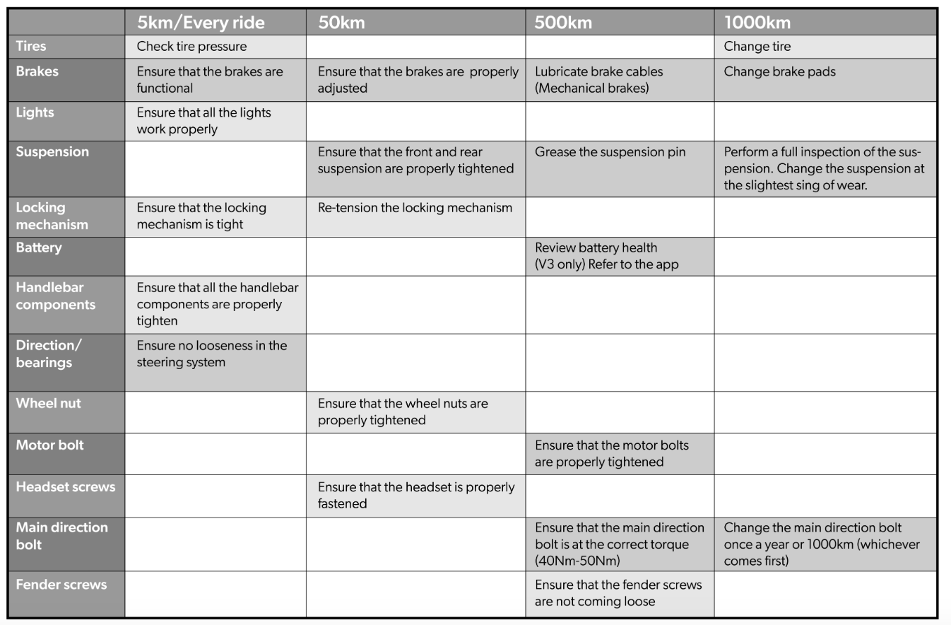 The following maintenance table should be used to determine when to inspect certain parts of the scooter, when to change certain components, and when to re-torque specific bolts and fasteners This maintenance table is specific to the Legacy Apollo Phantom scooter and will be modified as needed. You can also find a copy of this maintenance table in the User Manual here.