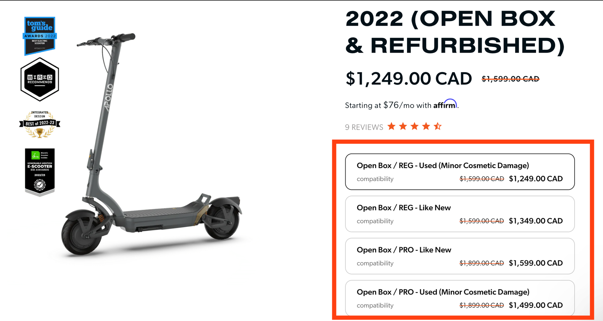 At Apollo, our commitment is to offer customers a diverse range of options, accommodating various preferences and budgets. Throughout the purchasing process, on the product page, you'll encounter various versions of the scooter available for selection, including Like-New, lightly used, or Used (Minor Cosmetic Damage). We're here to provide guidance on the meanings of these terms and how they might perfectly align with your specific needs. As shown in the photo below: